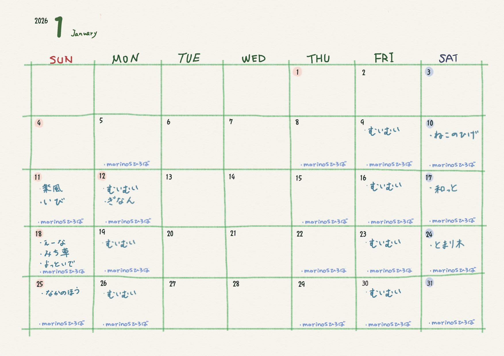<2026年 1月の岐阜県内プレーパーク(冒険遊び場)カレンダー>